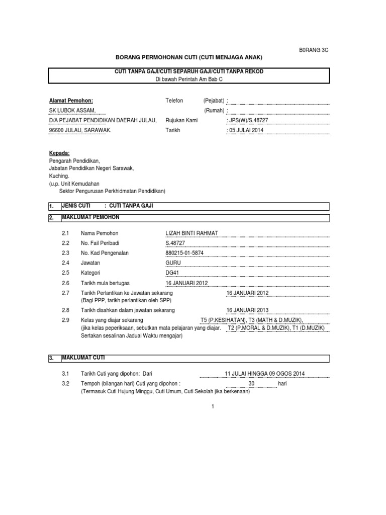 Borang permohonan cuti tanpa gajitanpa rekod Sila penuhi dalam 2 salinan hendaklah dikembalikan ke bahagian Personel Jabatan Pendaftar sekurang-kurangnya seminggu sebelum bercuti bagi permohonan di dalam negeri atau 1 bulan bagi permohonan luar negara. Kepala baak universitas gunadarma di tempat hal. Contoh surat rasmi cuti bersalin b tanpa gaji permohonan kerja persediaan bercuti kakitangan kerajaan mohon rekod borang rehat pekerja.