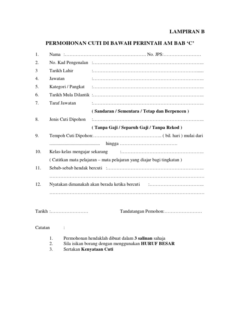 Borang Permohonan Cuti Tanpa Gaji Separuh Gaji JKN. Borang permohonan cuti tanpa rekod ctr perintah am bab c cuti tahun 1974 surat pekeliling perkhidmatan bil. Contoh Borang Cuti Tanpa Rekod Permohonan bantuan bekalan makanan tan sri muhyiddin yassin perdana menteri malaysia telah membuat pengumuman khas semasa tempoh perintah kawalan pergerakkan pkp akan dilanjutkan sehingga 14 april kerana kes positif bagi covid 19 semakin bertambah.