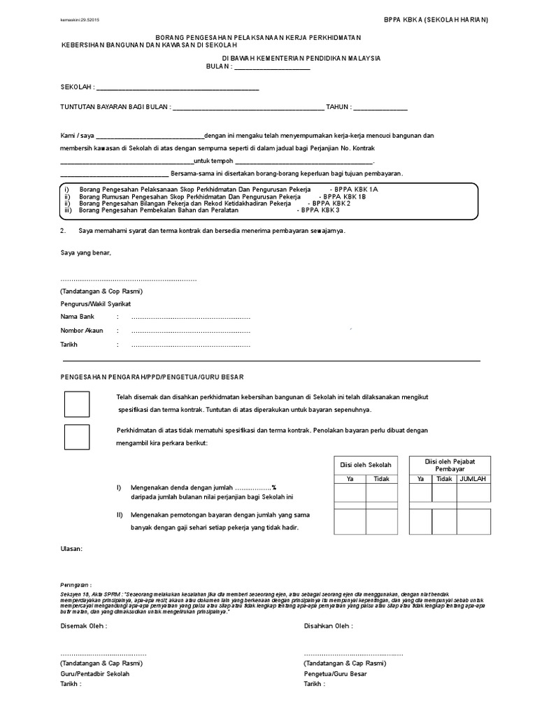 Borang Pengesahan Bilangan Pekerja dan Rekod Ketidakhadiran Pekerja bagi Perkhidmatan KBK KPM xls 685 KB 977 muat turun 19 Feb 2019. Rekod Latihan Individu PM-0417 12. Pdf Surat Pekeliling Ikhtisas Bil21983 Kantin Sekolah pdf.