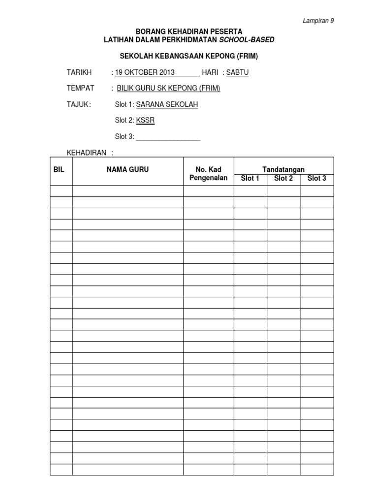 Lampiran 9 Borang Kehadiran Kursus Pdf