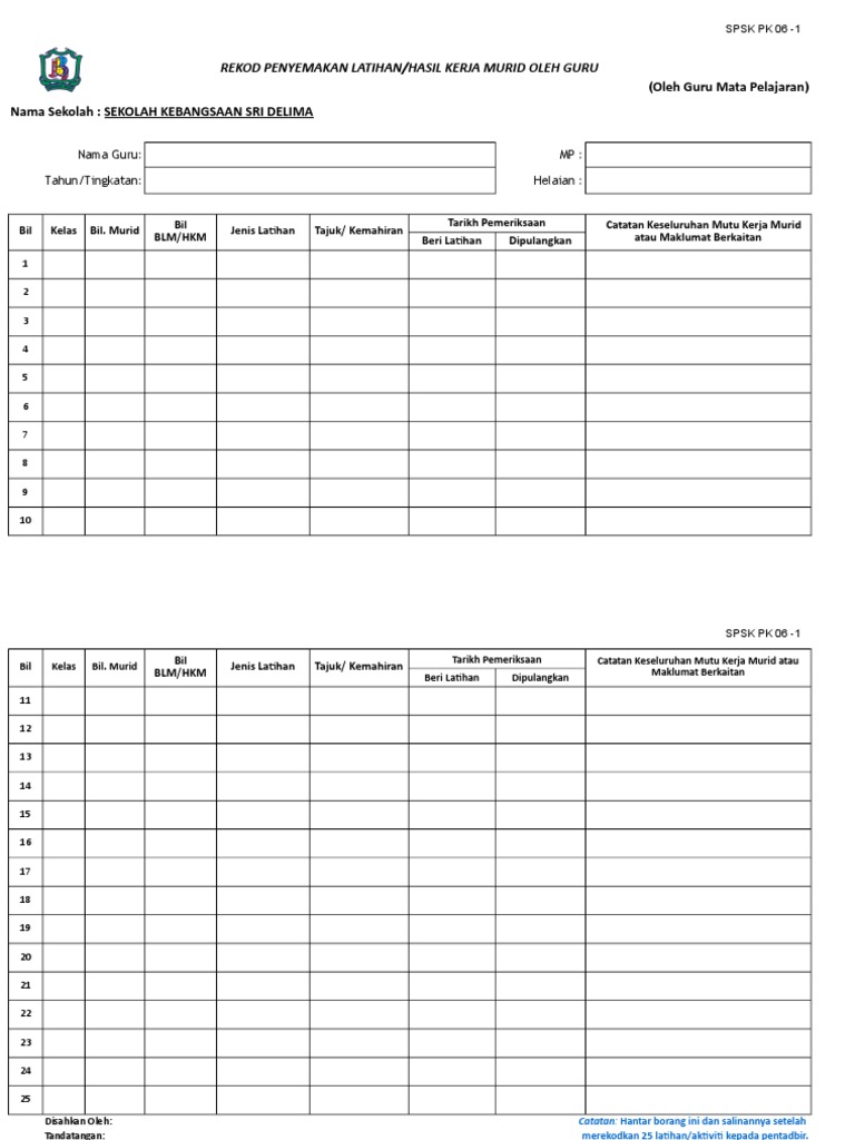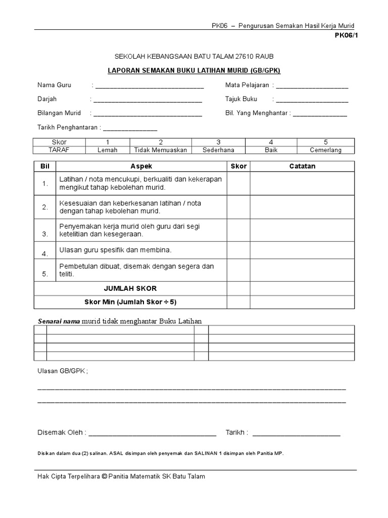 Borang Pk 06 2 Rekod Semakan Kerja Murid Pgb. Spsk pk 061 2 laporan semakan buku nota latihan murid spsk pk 062 3 borang. Jadual Semakan Buku Latihan Murid.