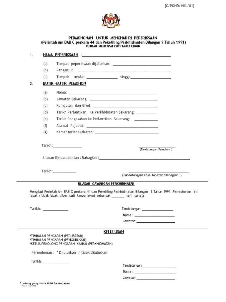 Sijil Cuti Sakit 4. BORANG PERMOHONAN CUTI PERMOHONAN CUTI TANPA REKOD MENDUDUKI PEPERIKSAAN Di Bawah Perkara 44 Perintah A Bab C dan Pekeliling Perkhidmatan Bil9 Tahun 1991 PINDAAN Alamat Pejabat. Kerajaan telah meluluskan hak untuk mengambil cuti tanpa rekod buat penjawat awam sama ada islam mahupun bukan islam atas alasan keagamaan kata menteri kewangan lim guan eng.