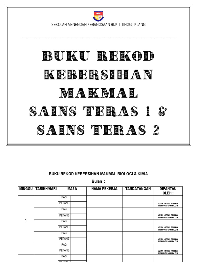 Buku Rekod Kebersihan Makmal Cover Pdf