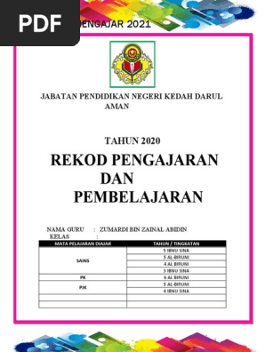 Fail rekod mengajar negeri kedah 2019. January 03 2020 Buku Rekod Pengajaran Untuk kawan-kawan guru yang mengajar di Negeri Kedah saya sediakan lembaran yang ada dalam Fail RPH yang disediakan oleh JPN. KELEBIHAN FAIL REKOD PERSEDIAAN MENGAJAR 2019 NI CIKGU2 BOLEH TENGOK KAT BAWAH NI. Harap dapat memberikan manfaat kepada semua warga pendidik.