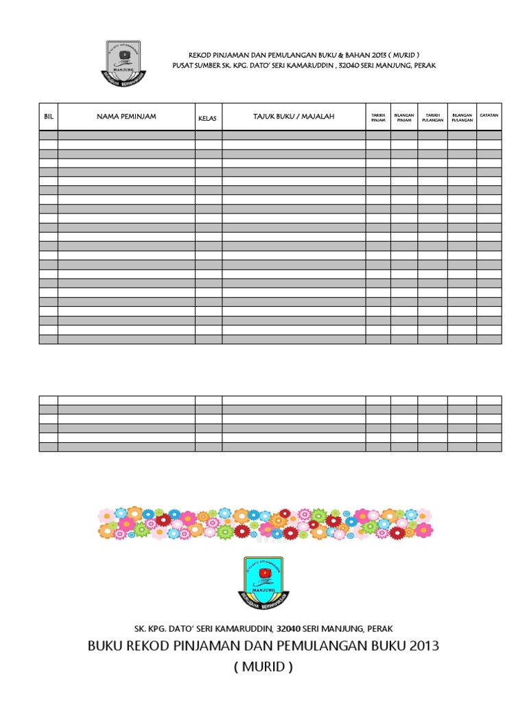 Perpustakaan sekolah kebangsaan taman pelangi rekod pinjaman buku bahan bercetak murid bil. Ppps dg-41 bulan tarikh penghantaran tandatangan penyemak catatan januari februari mac april mei jun julai ogos. Peminjaman buku teks setiap pelajar diberi satu borang yang.