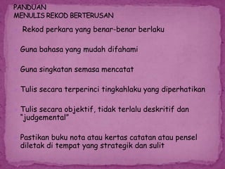 Kecemerlangan yang sebenar-benarnya tidak dapat dihasilkan oleh individu atau kumpulan individu yang mempunyai ilmu kemahiran dan kesihatan semata-mata. Muat turun dari Blog Cikgu Azlan. DEFINISI Satu catatan mengenai peristiwa atau tingkah laku murid yang dianggap penting dan signifikan untuk direkodkan.