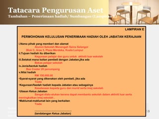 Dengan menggunakan dokumen-dokumen berikut. 13 Membolehkan keadaan aset diketahui. TATACARA PENERIMAAN ASET HADIAHSUMBANGAN.