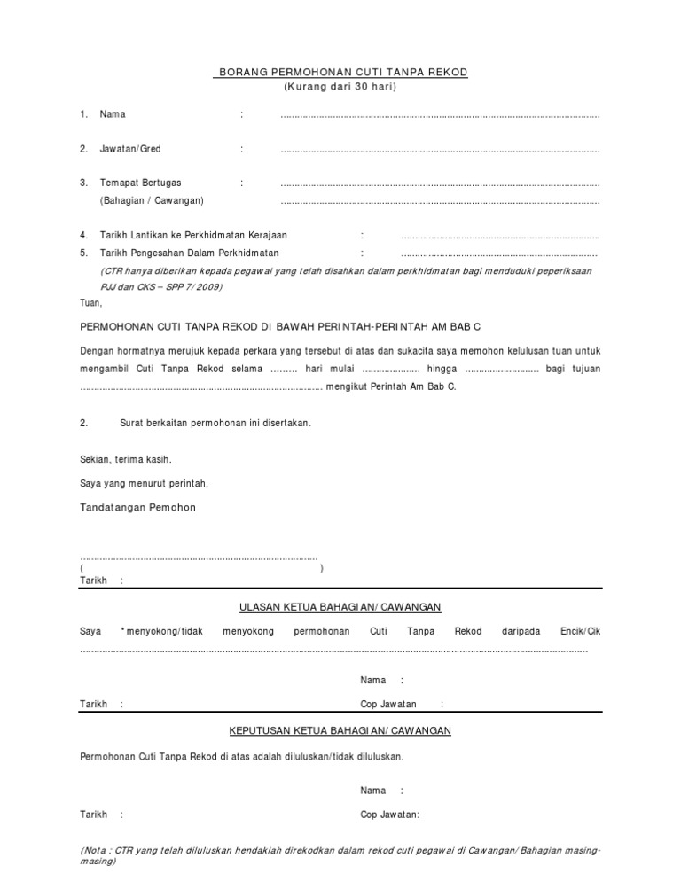 Kerajaan telah meluluskan hak untuk mengambil cuti tanpa rekod buat penjawat awam sama ada islam mahupun bukan islam atas alasan keagamaan kata menteri kewangan lim guan eng. BORANG PERMOHONAN CUTI TANPA REKOD CTR Perintah Am Bab C Cuti Tahun 1974 Surat Pekeliling Perkhidmatan Bil. Borang permohonan cuti permohonan cuti tanpa rekod menduduki peperiksaan di bawah perkara 44 perintah a bab c dan pekeliling perkhidmatan bil 9 tahun 1991 pindaan alamat pejabat.