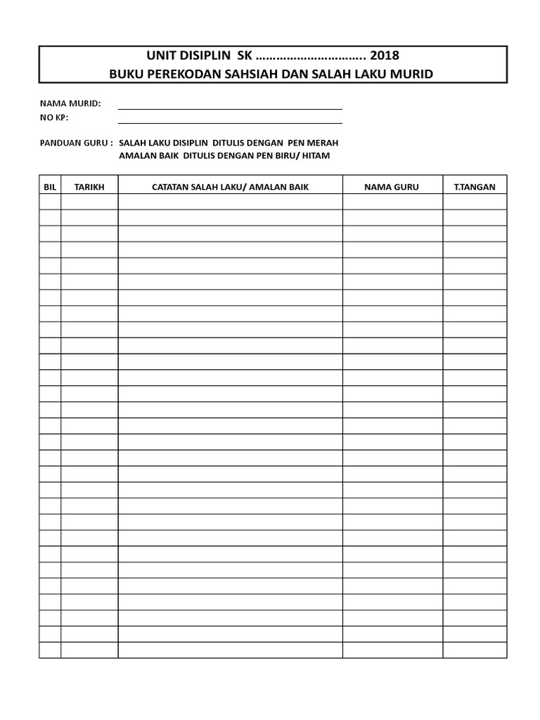 Rekod masalah disiplin dalam3. Mengadakan perbincangan dengan ibu bapa penjaga untuk menyokong pembelajaran murid di rumah. Ibubapa perlu menandatangani ruangan kebenaran bertulis dalam buku Rekod Kesihatan Murid RKM.