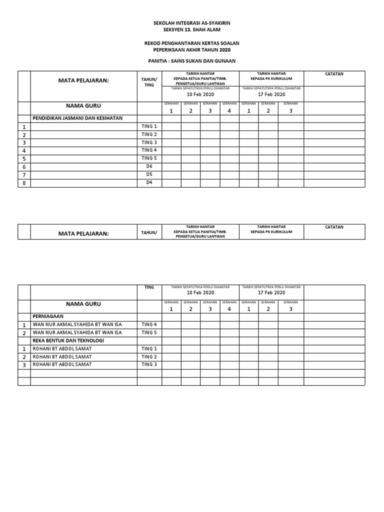 Rekod semakan kerja aktiviti murid oleh setiap guru mata pe lajaran gmp. Send the new Borang Penyediaan Kertas Soalandoc in a. Memastikan bilangan set kertas soalan adalah mencukupi dan dilebihkan sekurang-kurangnya dua salinan.
