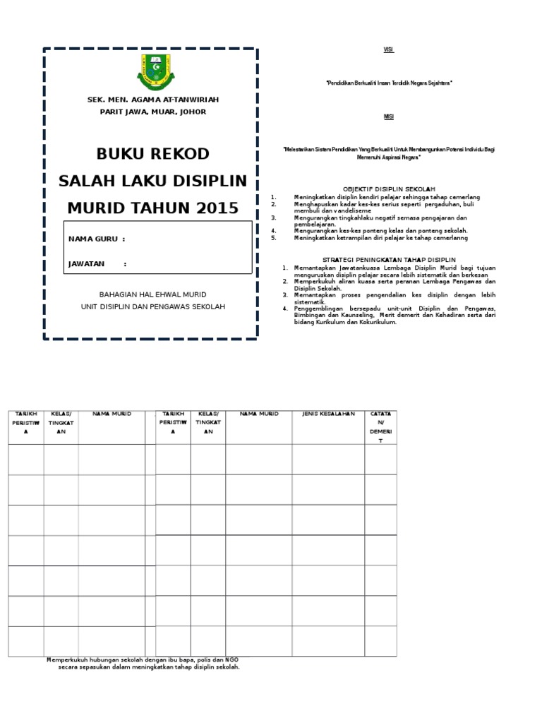 78 Pengurusan Perhimpunan Perhimpunan diadakan sekurang-kurangnya sekali seminggu Isnin. Buku rekod kes disiplin tahun 1 buku rekod kes disiplin tahun 2 buku rekod kes disiplin tahun 3 buku rekod kes disiplin tahun 4 buku rekod kes disiplin tahun 5 buku rekod kes disiplin tahun 6 buku rekod kes disiplin pra sekolah 2018 2018 related papers. Kebolehan menangani salah laku murid dengan cekap dan berkesan dengan meletakkannya pada tahap yang minimum dapat.