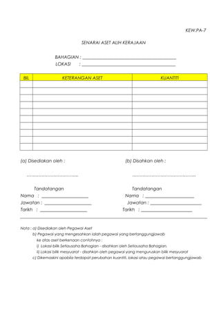 SENARAI ASET ALIH. Kew Pa 1 Borang Laporan Penerimaan Aset Alih Kerajaan. KEWPA-7 Senarai Aset dilokasi.