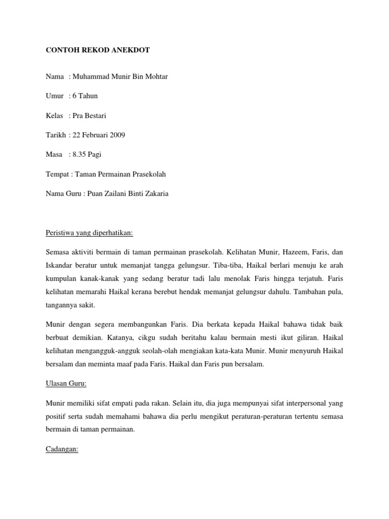 Contoh rekod anekdot kanak kanak bunuh diri contoh rekod anekdot kanak kanak contoh rekod anekdot kanak kanak keperluan khas contoh rekod anekdot kanak kanak pendidikan khas contoh rekod anekdot kanak kanak sama sama pergi mengaji contoh rekod anekdot kanak kanak perempuan berpegangan tangan contoh rekod anekdot kanak kanak berak berdarah. Pegawai JKM yang diberi kuasa berhak untuk memeriksa rekod-rekod ini semasa sesi pemantauan ke TASKA. 1000 pagi Nama Guru.