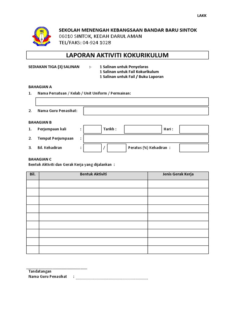 Contoh Borang Laporan Aktiviti Kokurikulum Mingguan Pdf