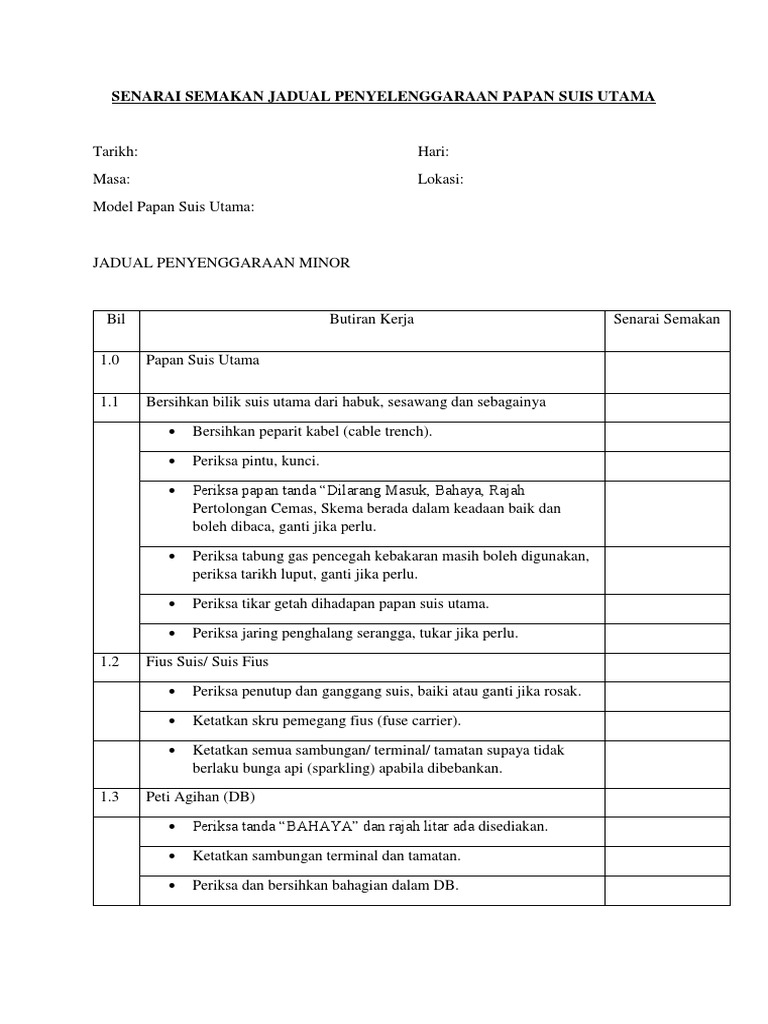 Rais bin maatketua program kejuruteraan elektrikinstitut latihan dan pembangunan infrastruktur prosidur senggaraan acb pastikan kunci pintu tikar getah alat pemadam api tanda awas bahaya 415v dilarang masuk berada. RM 3000 Baki penghutang 31122016. Contoh Borang Penyelenggaraan Kenderaan PPASK 301 Lampiran 2 93 Contoh Surat Maklumbalas Aduan Kerosakan PPASAm 414 Lampiran 3 94 Contoh Borang Pengukuran Suhu dan Kelembapan di Ruang Bacaan Pengguna PPAS Am 416 Lampiran 4 95 Contoh Borang Pemantauan Serangga Perosak Anai-anai PPAS Am 415 Lampiran 5 96.