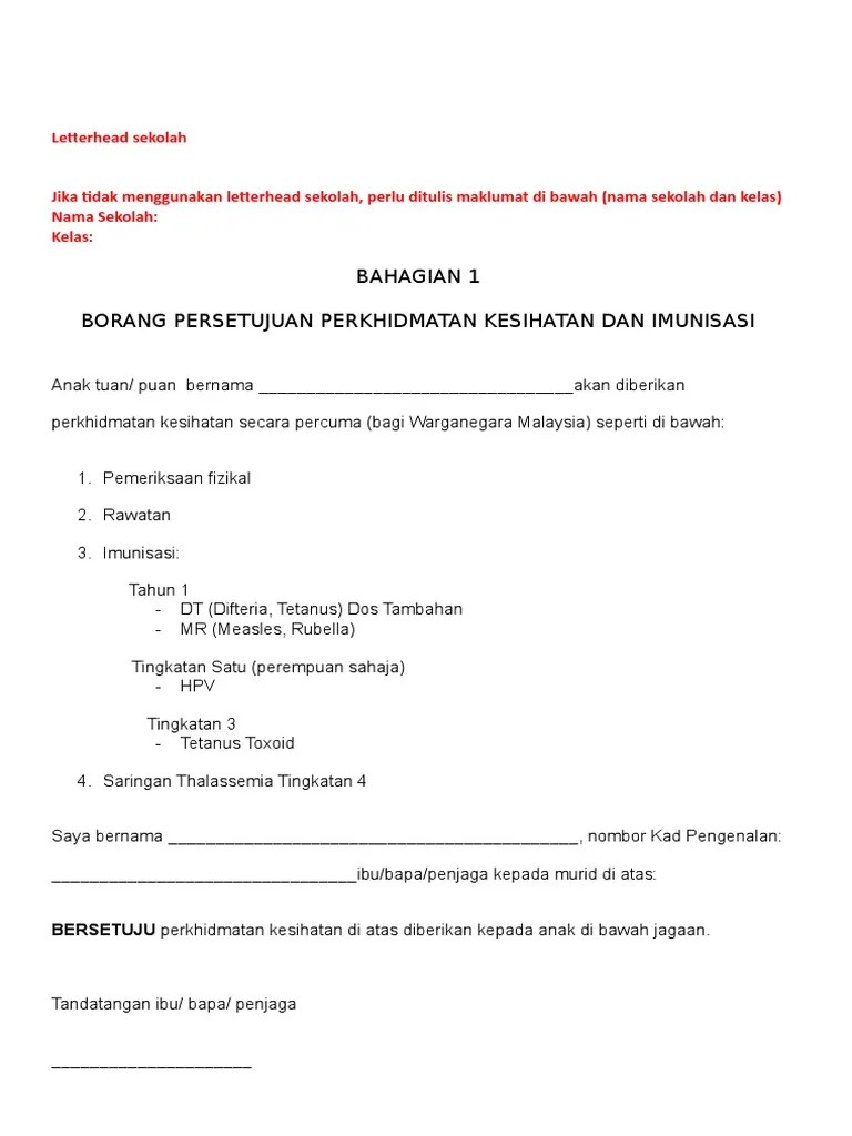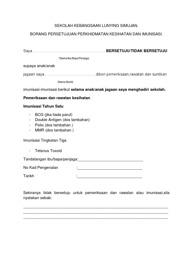 Borang Persetujuan Perkhidmatan Kesihatan Dan Imunisasi Tahun 1