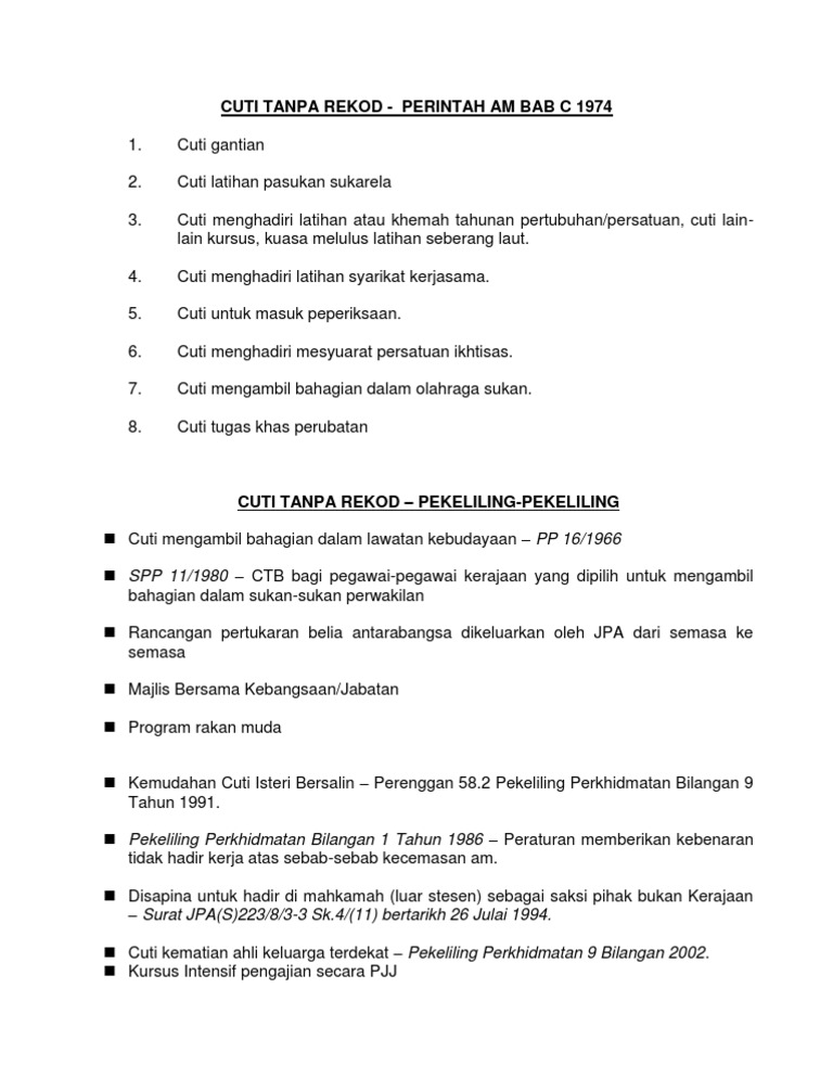 Antara syarat-syarat tersebut adalah seperti berikut. Cuti tanpa rekod kemudahan isteri bersalin kepada pegawai lelaki. Tambahan 2 hari lagi untuk perjalanan pergi dan balik CUTI MENGHADIRI LATIHAN ATAU KHEMAH KERJA TAHUNAN PERTUBUHANPERSATUAN YANG DIBENARKAN 1.